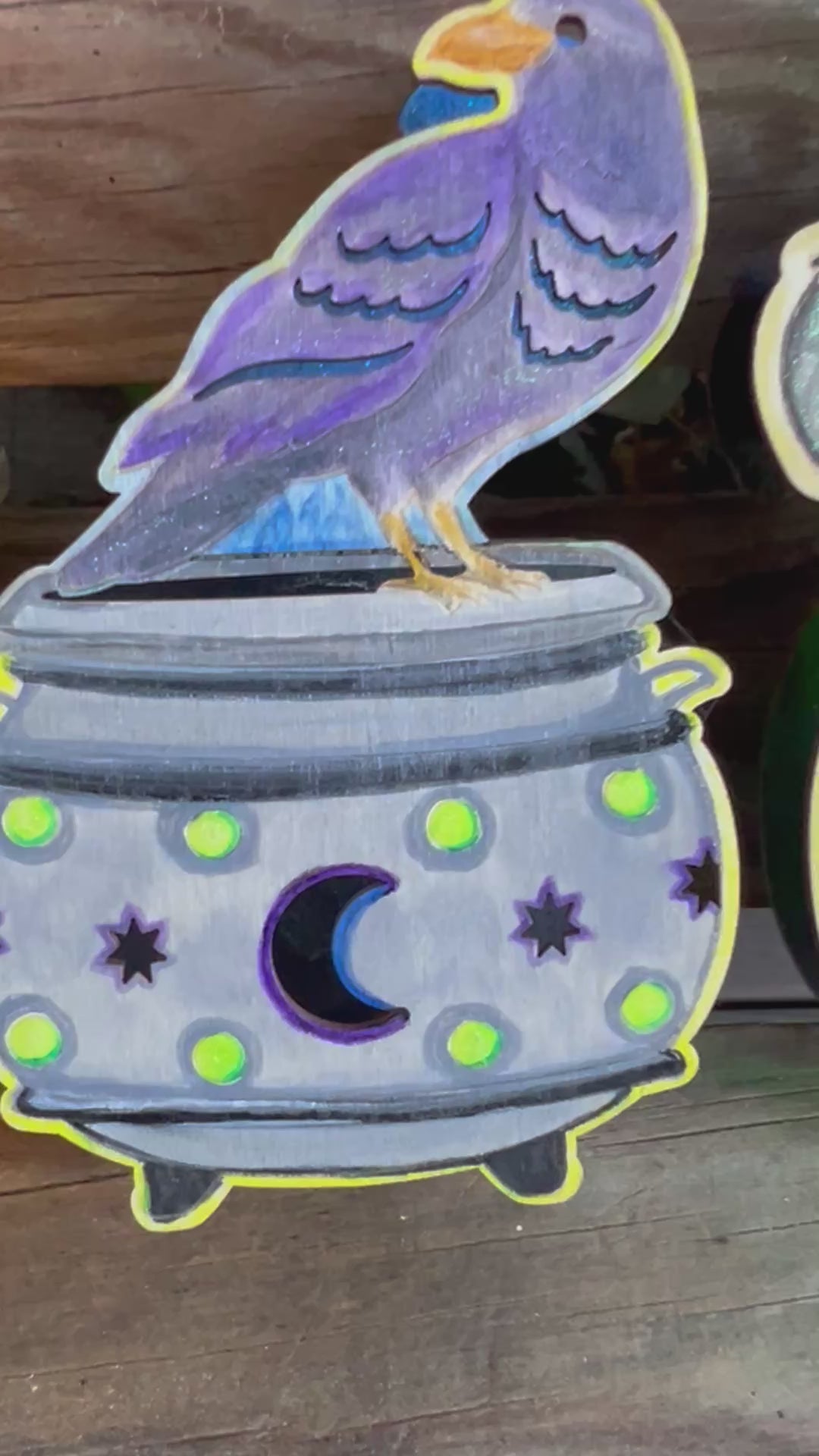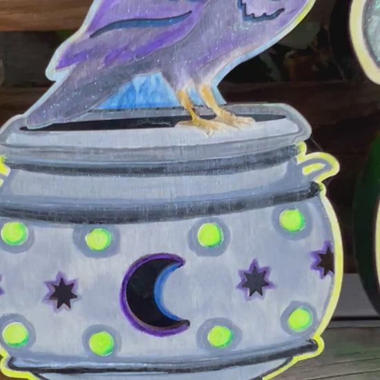Crow and cauldron measuring 5” inches wide by 7.5” tall.