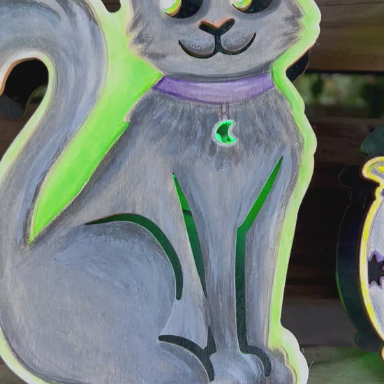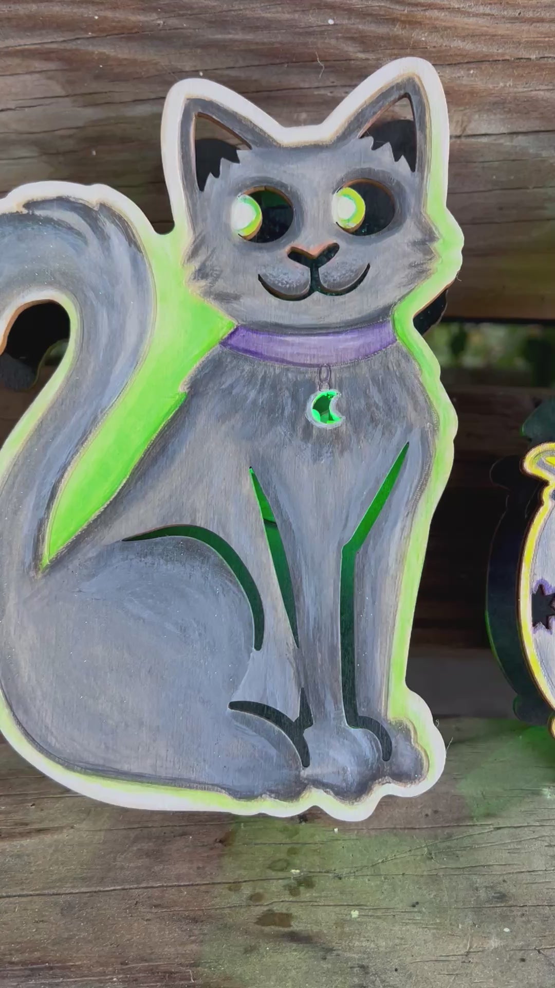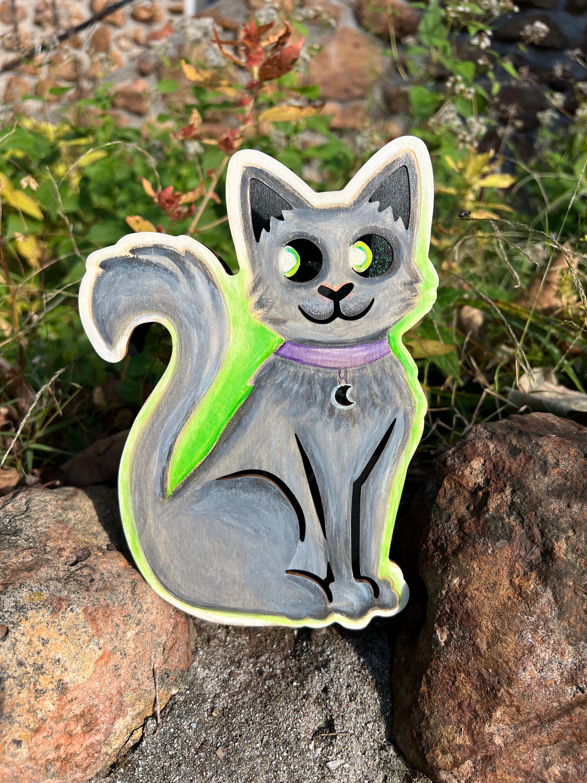 Sparkling cat with a purple collar measuring 7.5” inches tall by 5.25”inches wide. Painted by Sheena StandingBear.